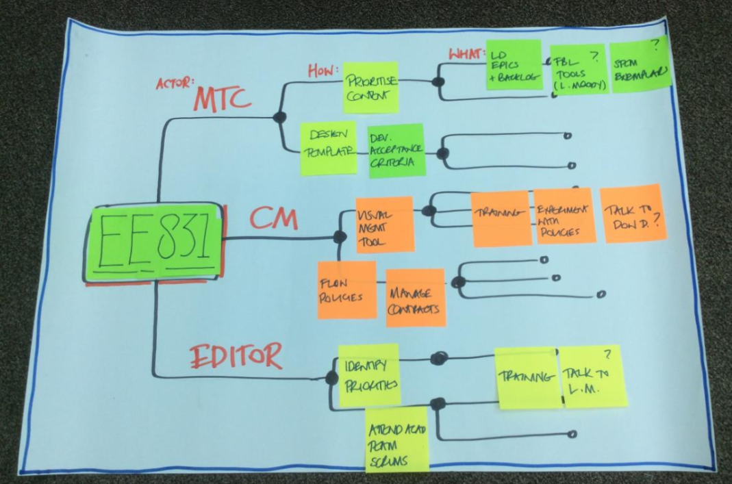 We are using impact mapping to support organizational change in a UK university. This university is experimenting with agile practices for the development of online courses. The course teams are made up of academics, project managers and content developers. They are all working on multiple missions and projects at once, so they struggle to find the time for training courses. The university doesn’t yet have an established agile development approach, and so under these circumstances it is very easy for individuals and teams to slip back into old ways of working.