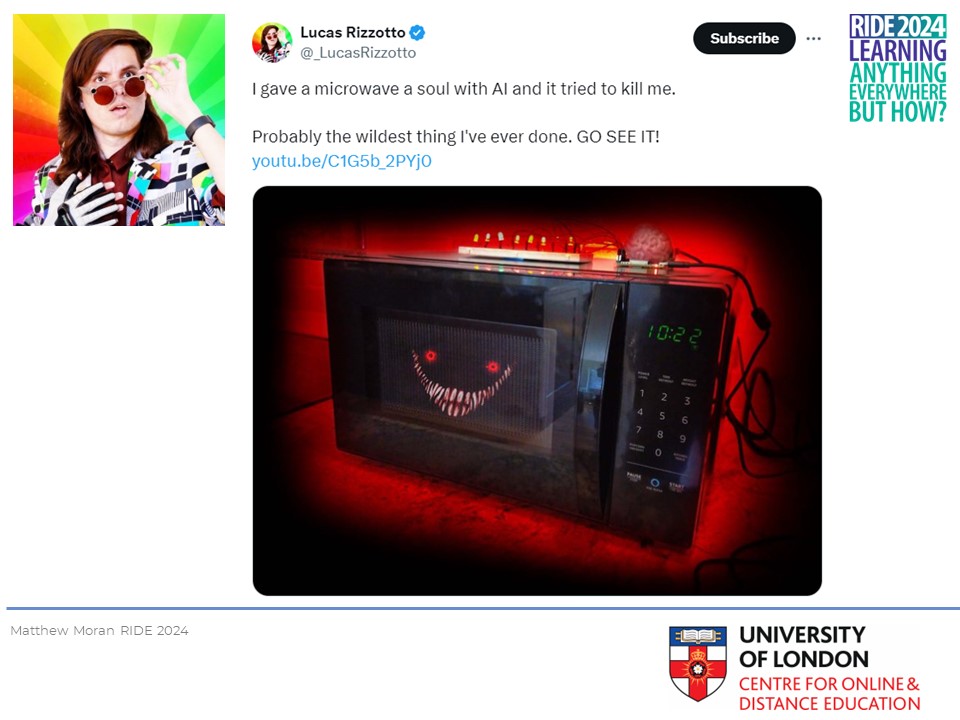I’d love to talk with you more about speculative design and edtech, but you will find it way more fun to go check out Lucas Rizzotto on the socials for hilarious mad-professor experiments with AI. Lucas famously gave his microwave not only AI emotions but an AI soul, only for the oven to take revenge by trying to cook him alive. Loads of hilarious takes on AI smart glasses too, over on YouTube.