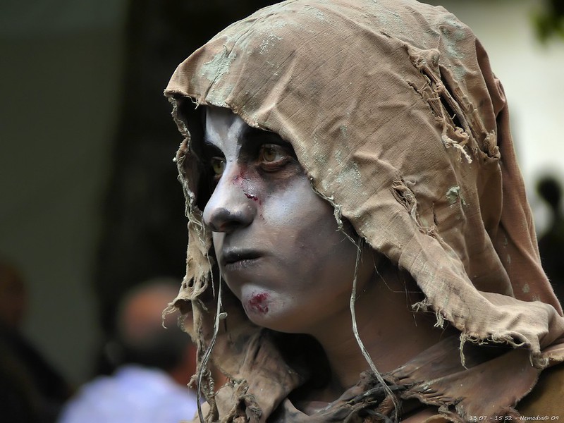 Image description: this post contains a photo entitled medieval women, a colour photo of the head and face of a young woman who looks to the left with piercing green eyes. She wears a tattered and fraying earth-coloured hooded garment, and theatrical make up on her face, dark around her eyes, pale grey across her face, with patches of red like blood on her nose and chin.