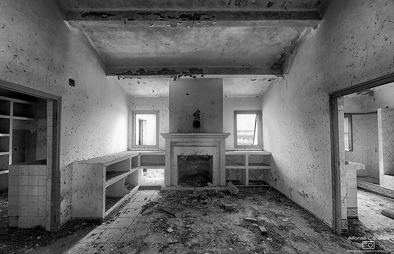 This post is accompanied by a black and white photo by Alfonso Cr, dated 2016 and entitled Urbex, in which we see the interior of the kitchen of a formerly grand and lavishly decorated house. There is a large carved stone fireplace at the centre, and marble counters and shelves. To either side we can just see into adjoining rooms, decorated with painted tiles. However, the rooms are abandoned and in a ruinous state, the floor of the kitchen is covered with rubble and debris, the plaster is falling from the ceiling, and the walls are cracked, peeling and pitted with holes.