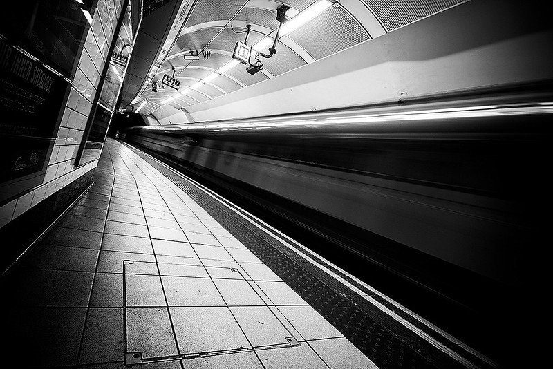 This post is illustrated with a black and white photo of a London underground (metro) train travelling at speed through a station. The photo was taken from a low point of view on the platform, creating a dramatic perspective which is accentuated by the strong contrasts of light and dark.